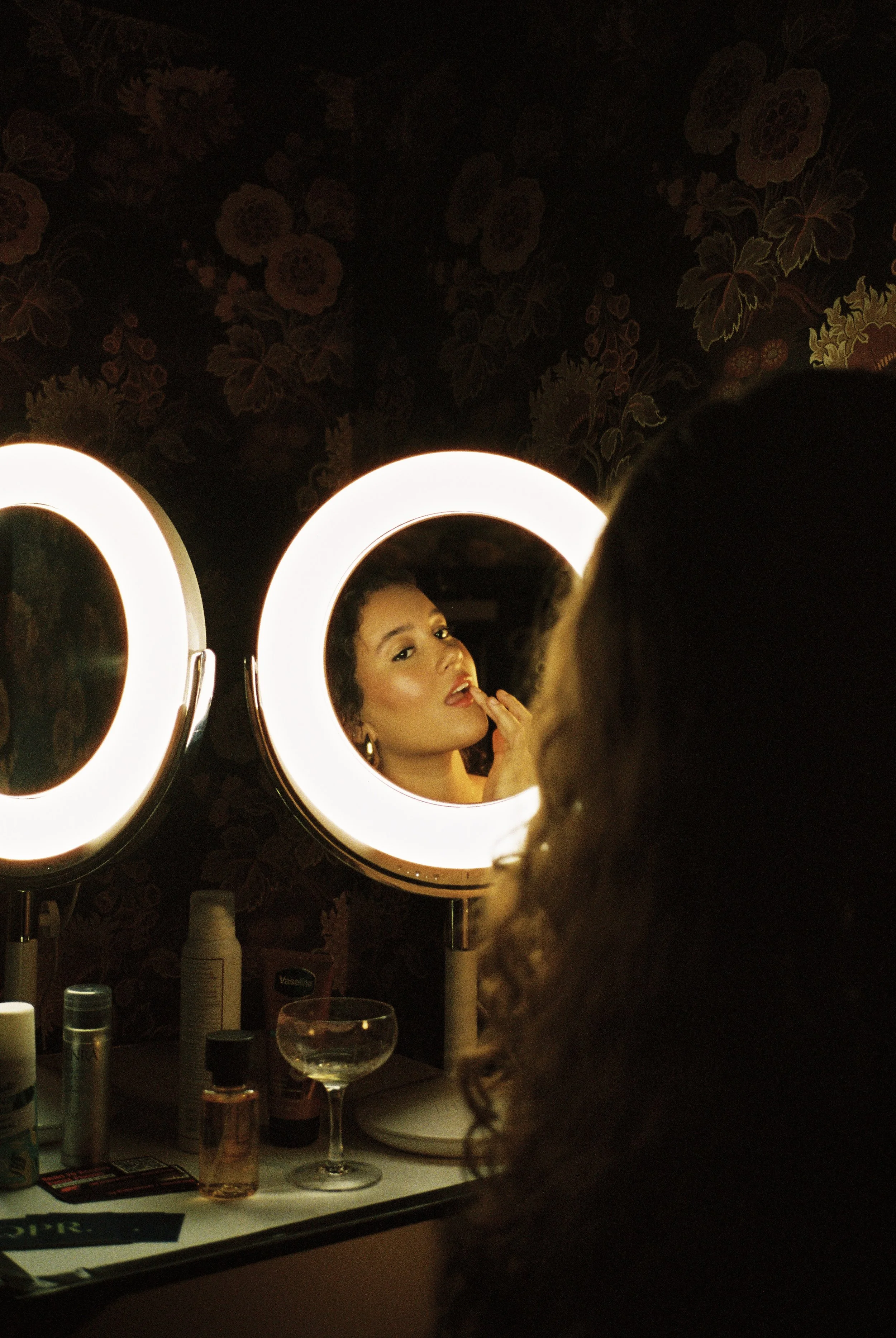 Camisha Smith reapplies her lipstick using Ilios Lighting's Beauty Ring and glam station.
