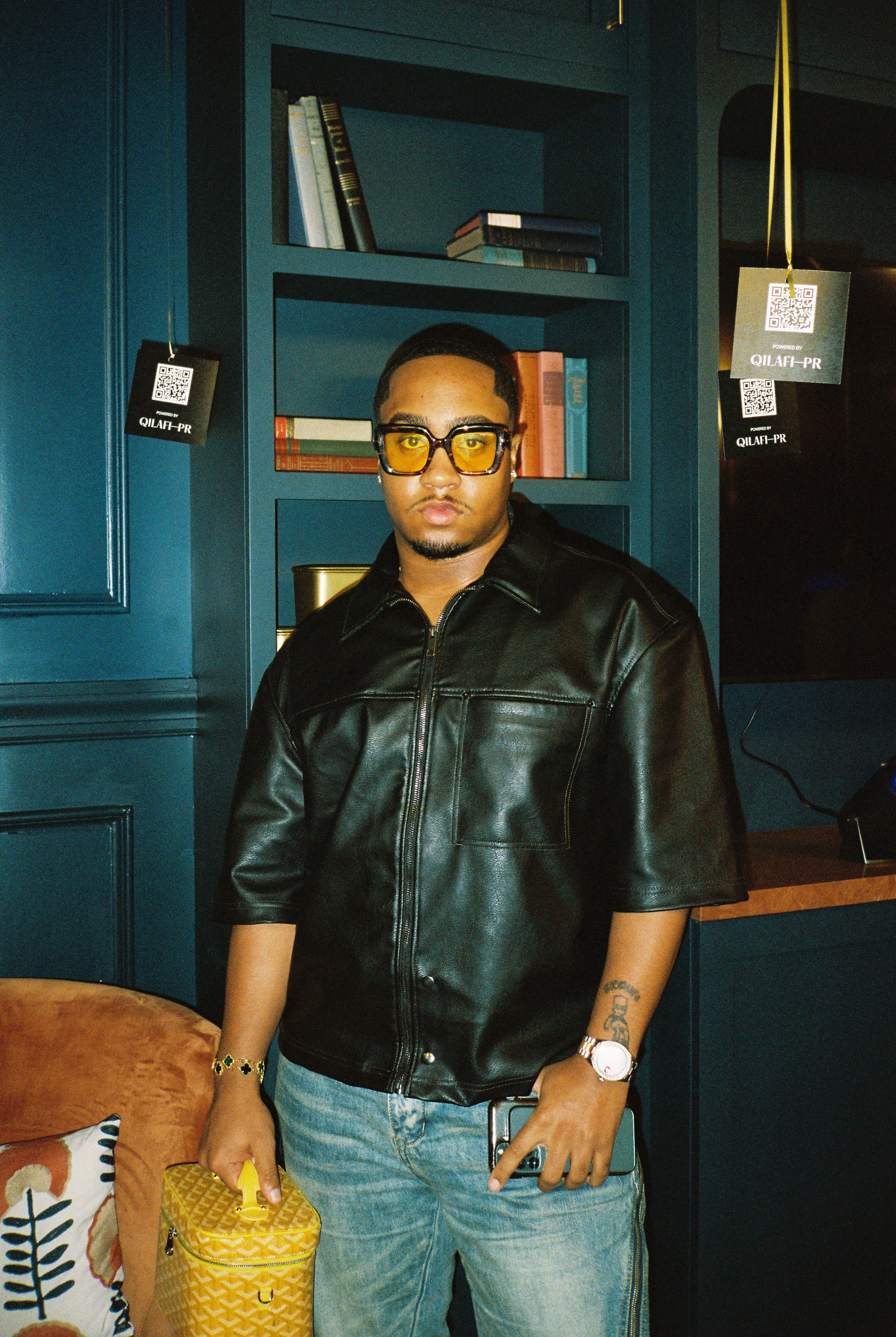 Tae Morgan, a celebrity fashion stylist, accessorised his leather on denim fit with a Goyard Muse Vanity Bag in yellow and Van Cleef & Arpels bracelets.