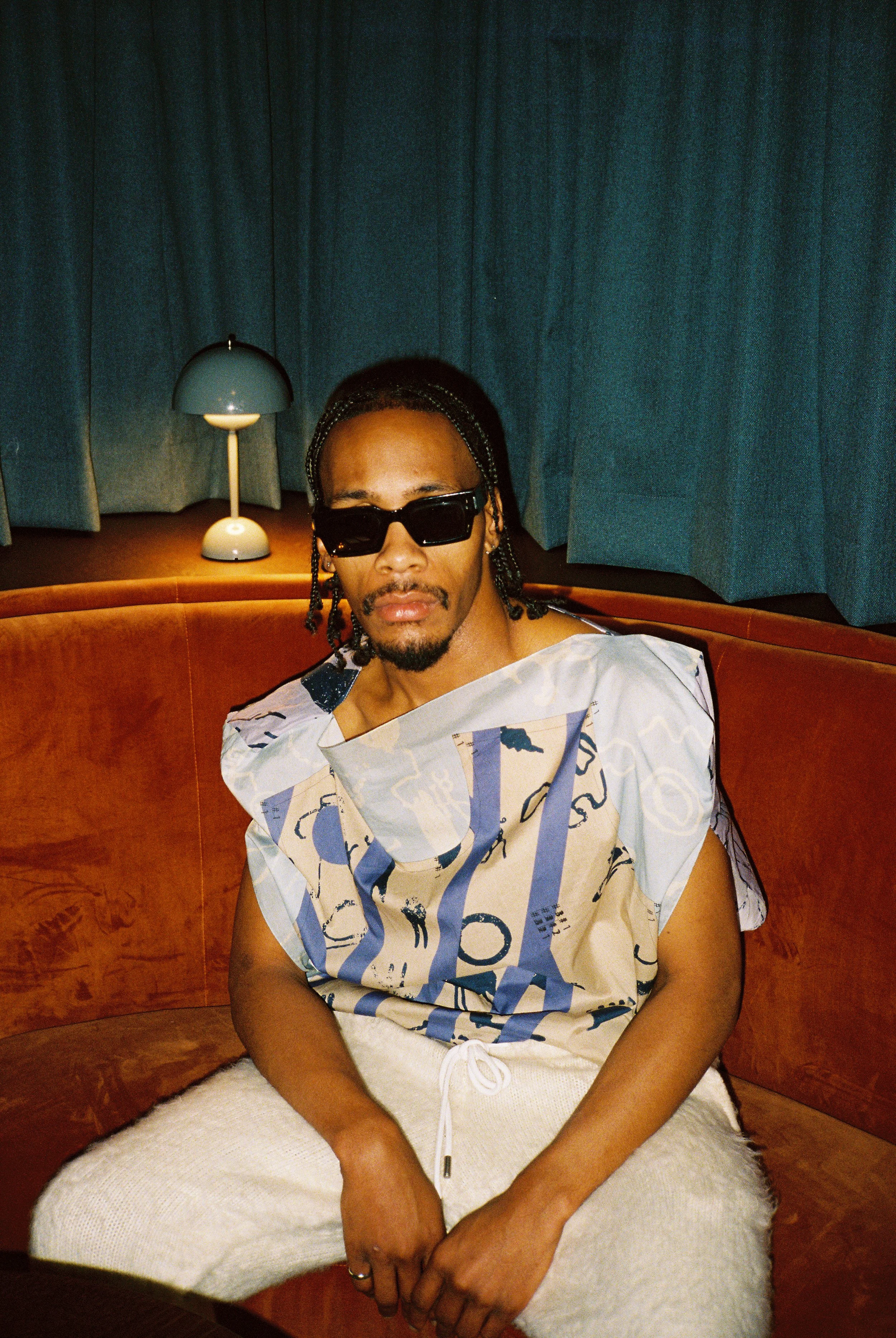 Marland Moore, a fashion stylist, wore a Vivienne Westwood top with graphic motifs.