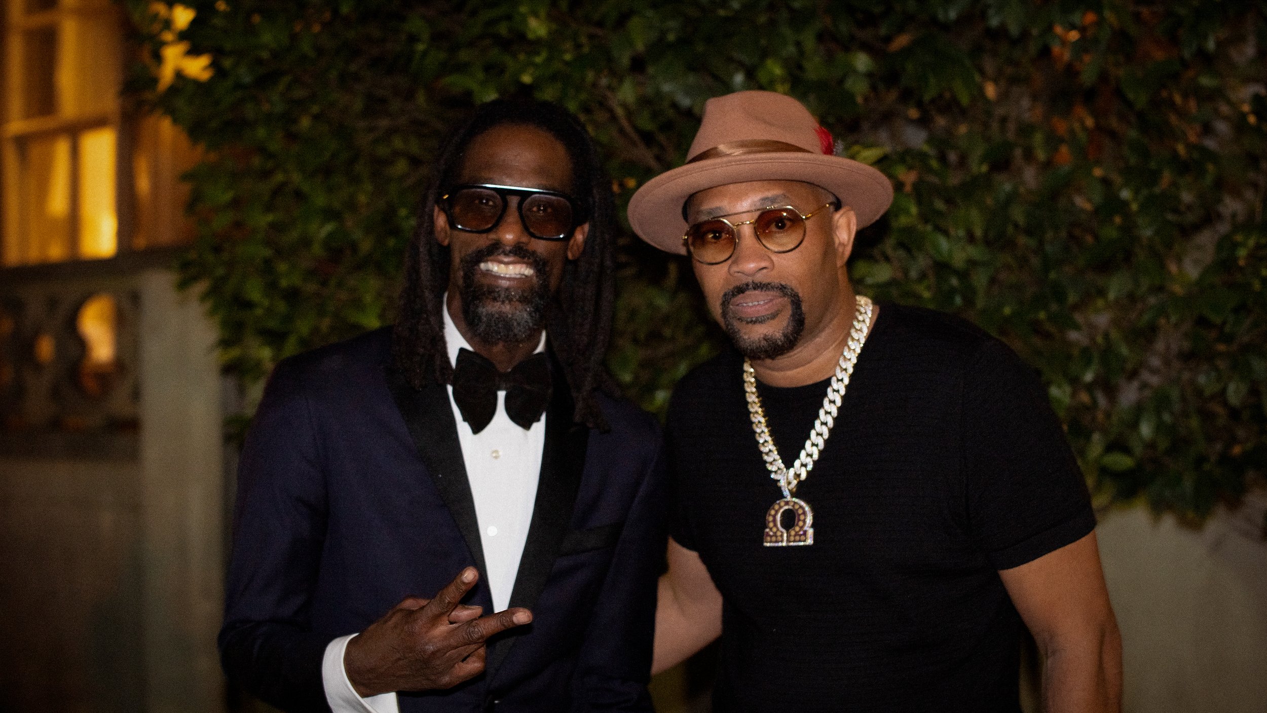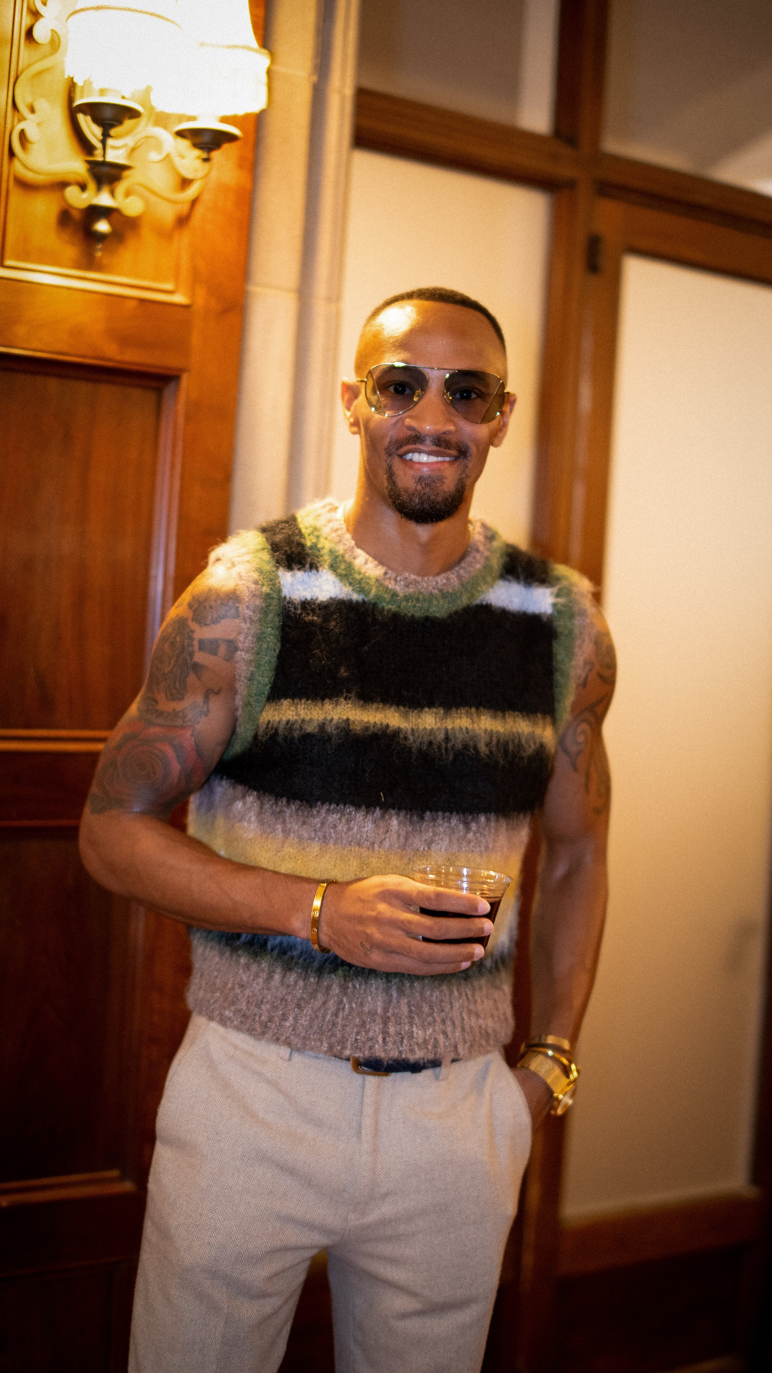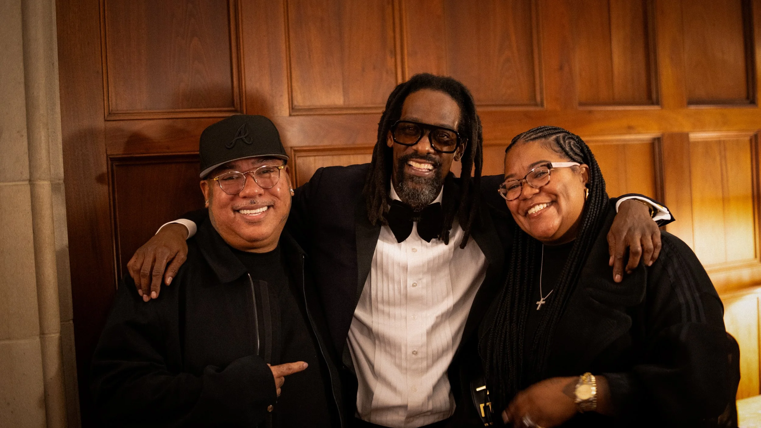 Donray Von (left), Founder of investment firm Castleberry & Co., poses for a photo in front of a collage with Shannon and another guest.