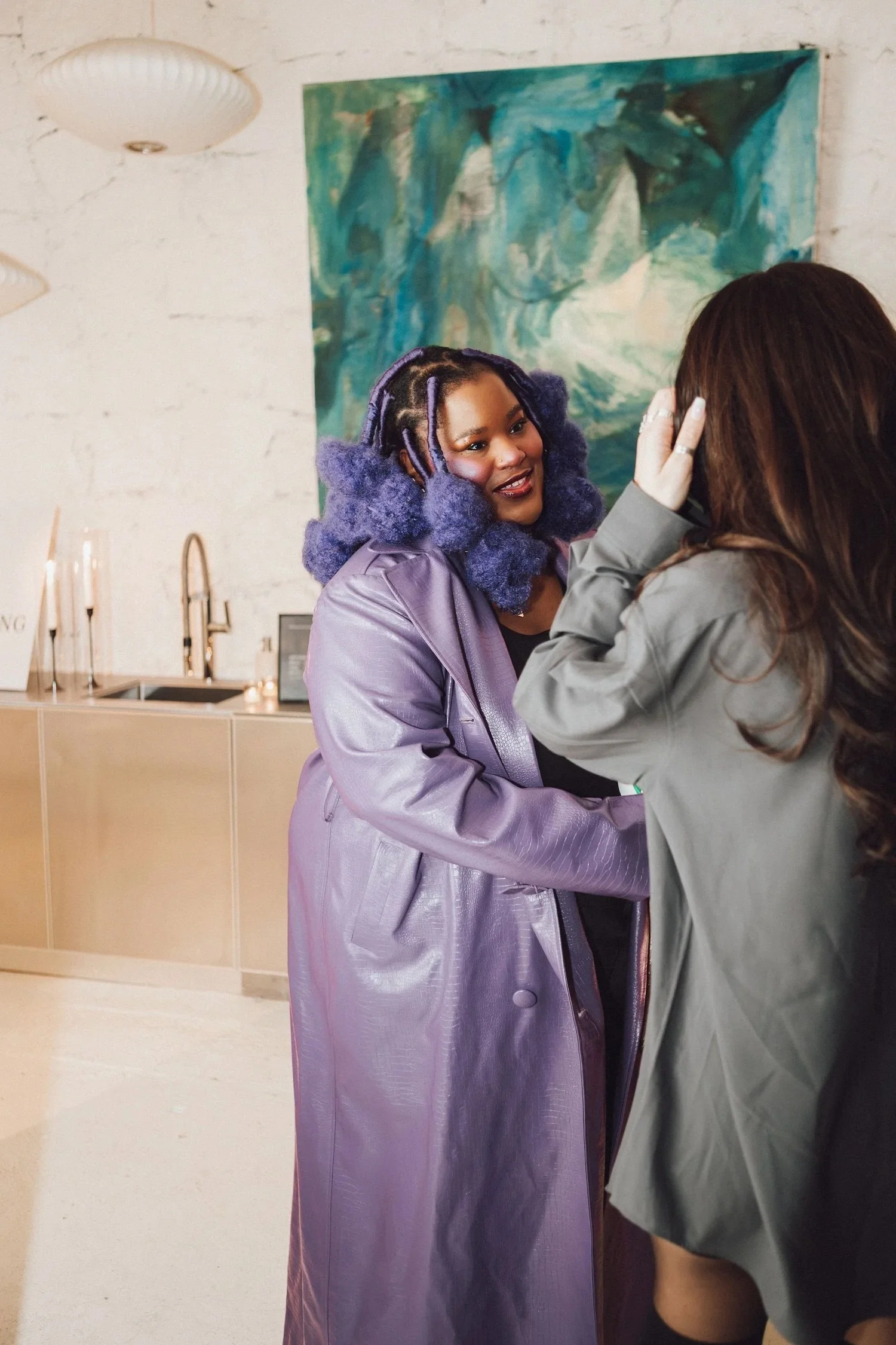 Honoree Jayde Powell stunned in a purple coat and matching hair.